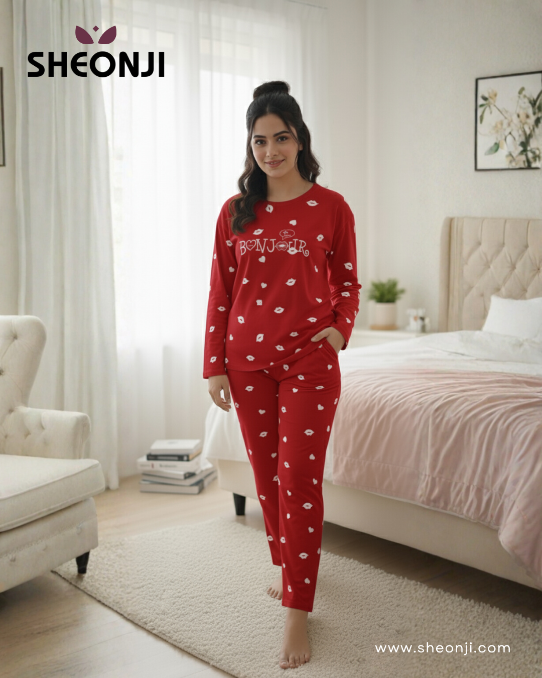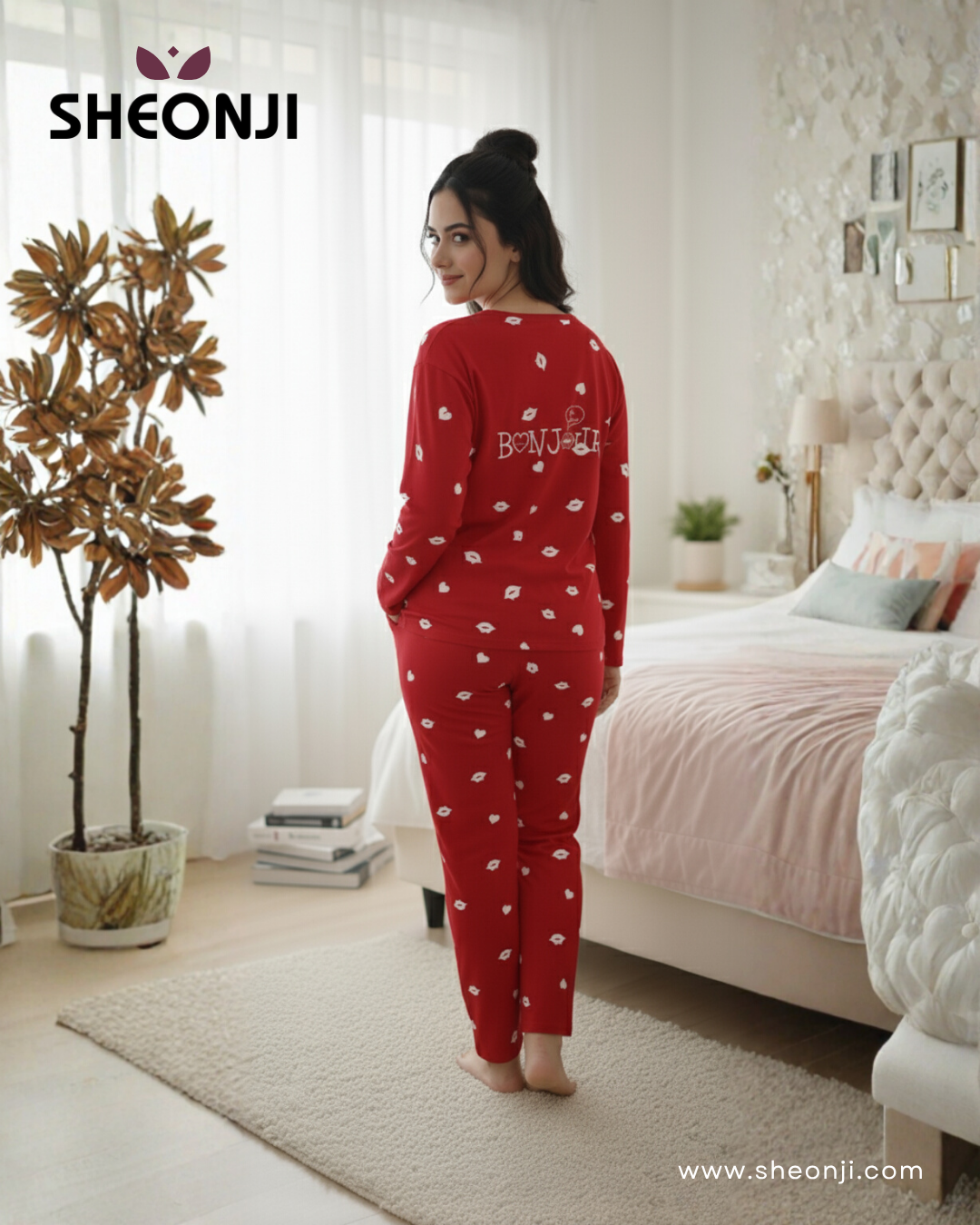Crafted from a soft, breathable cotton blend, this two-piece set offers a gentle embrace, making it ideal for cozy nights and lazy mornings alike. The stylish, full-sleeve shirt is perfectly paired with comfortable, full-length trousers, providing complete warmth without compromising on flexibility or breathability. Whether you are settling down for a quiet evening or enjoying a slow start to the day, the Crimson Bloom PJ set ensures luxurious, all-night comfort.