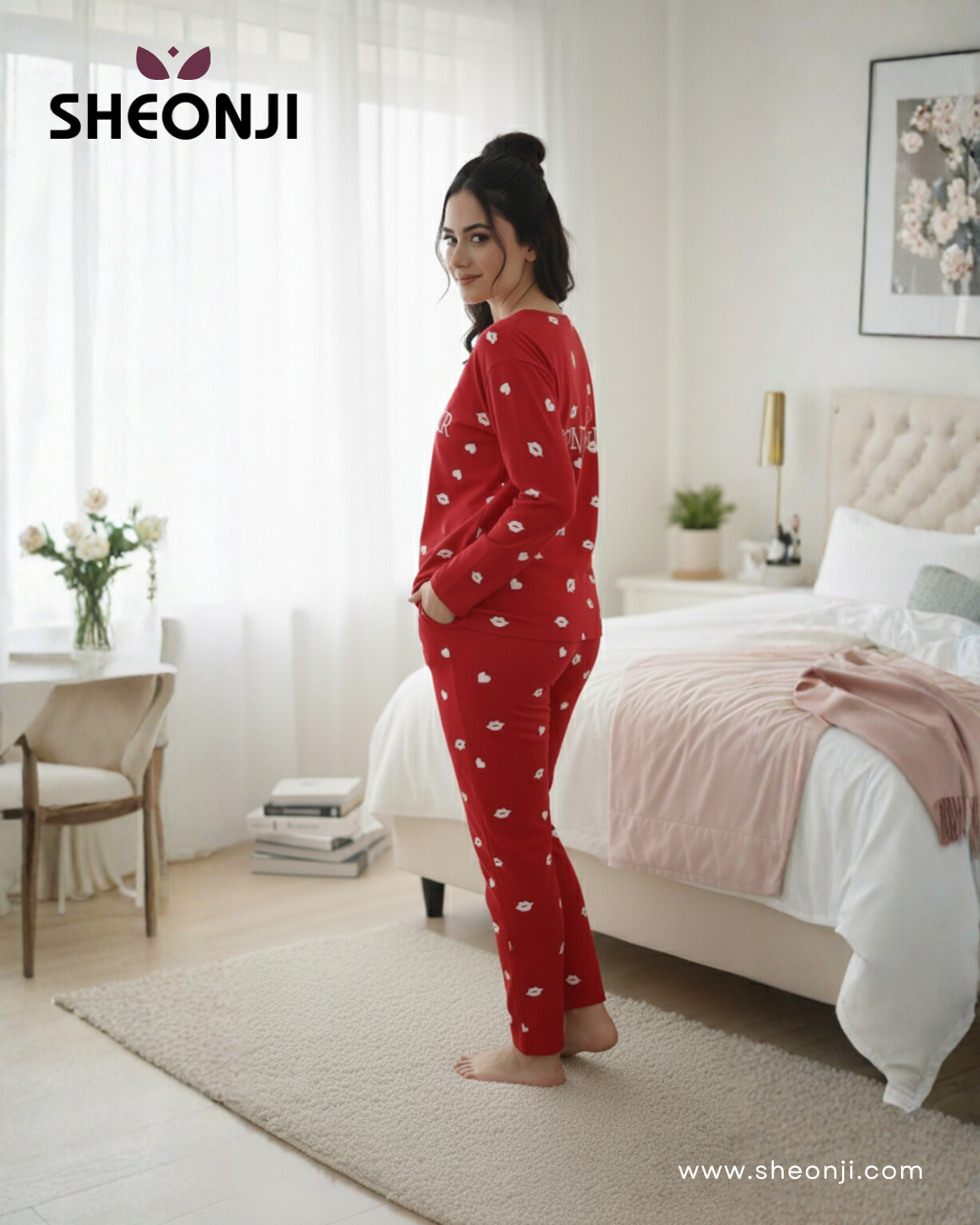 Experience the ultimate in softness and relaxation with the Crimson Bloom PJ set, a premium long-sleeved set from the elegant Moonlight & Dreams series. Designed for the modern woman who seeks both sweet style and supreme comfort, this pajama set is the perfect addition to your nightwear and loungewear wardrobe.